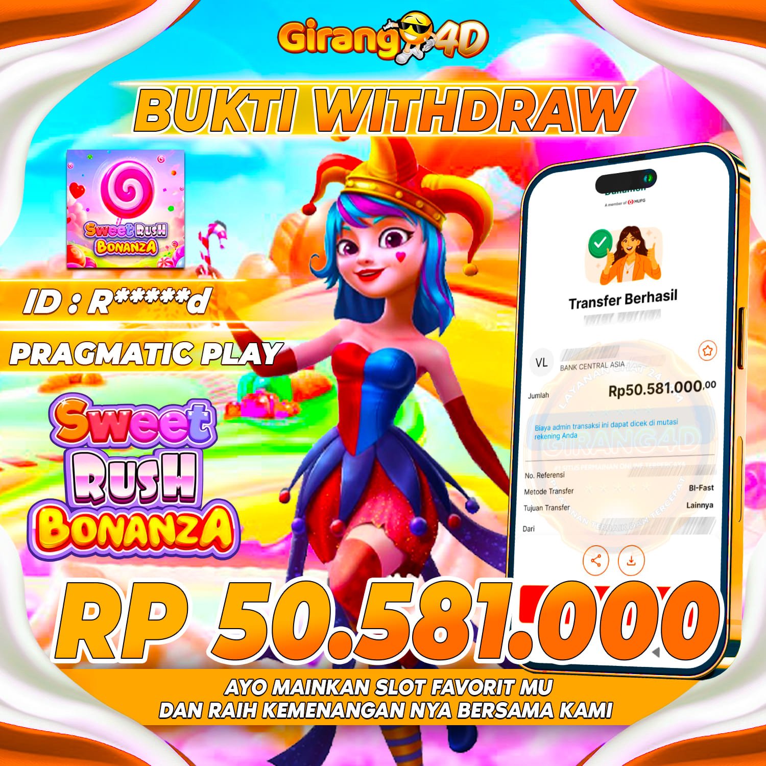 Selamat Kepada Id : R*****d Atas Withdraw Rp. 50.581.000 Juta Hari ini. Ditunggu Withdraw Selanjutnya dan ajak juga teman temannya bergabung di GIRANG4D